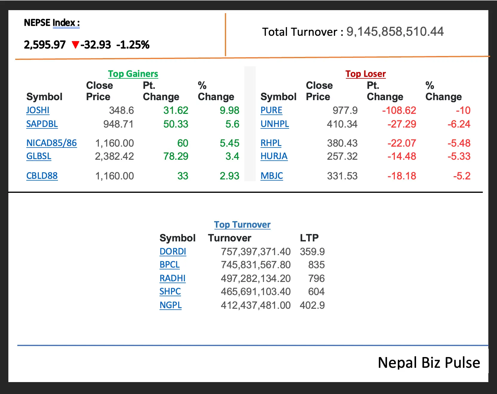 आजको सेयर बजारमा उच्च कारोबार (Top Turnover) भएका कम्पनीहरू प्रायः सबै हाइड्रोपावर क्षेत्रबाट रहेका छन्, जसमध्ये डोर्डीखोला हाइड्रोपावर, बुटवल पावर, राधी विद्युत, सानिमा माई, र नाग्दि ग्रुप पावर अग्रस्थानमा देखिए। यी कम्पनीहरूमा उच्च कारोबार देखिनु सकारात्मक संकेत जस्तो लाग्न सक्छ, तर बजार समग्ग्ररत: घट्दो अवस्थामा रहेकाले यो गतिविधि सम्भवतः बिक्री दबाब (selling pressure) को कारणले भएको हो। धेरै लगानीकर्ताहरूले लाभ लिने उद्देश्यले या बजारको अस्थिरता देखेर जोखिम कम गर्न सेयर बेच्ने निर्णय लिएको हुन सक्छ। हाइड्रोपावर सेयरहरू पछिल्ला केही सातादेखि तीव्र रूपमा बढेका थिए, जसका कारण अहिले मूल्य समायोजनको चरण (correction phase) मा प्रवेश गरेको अनुमान गर्न सकिन्छ। लगानीकर्ताहरूले यसलाई मूल्य विश्लेषण गरेर दीर्घकालीन दृष्टिकोणमा हेर्नु उपयुक्त हुन ।