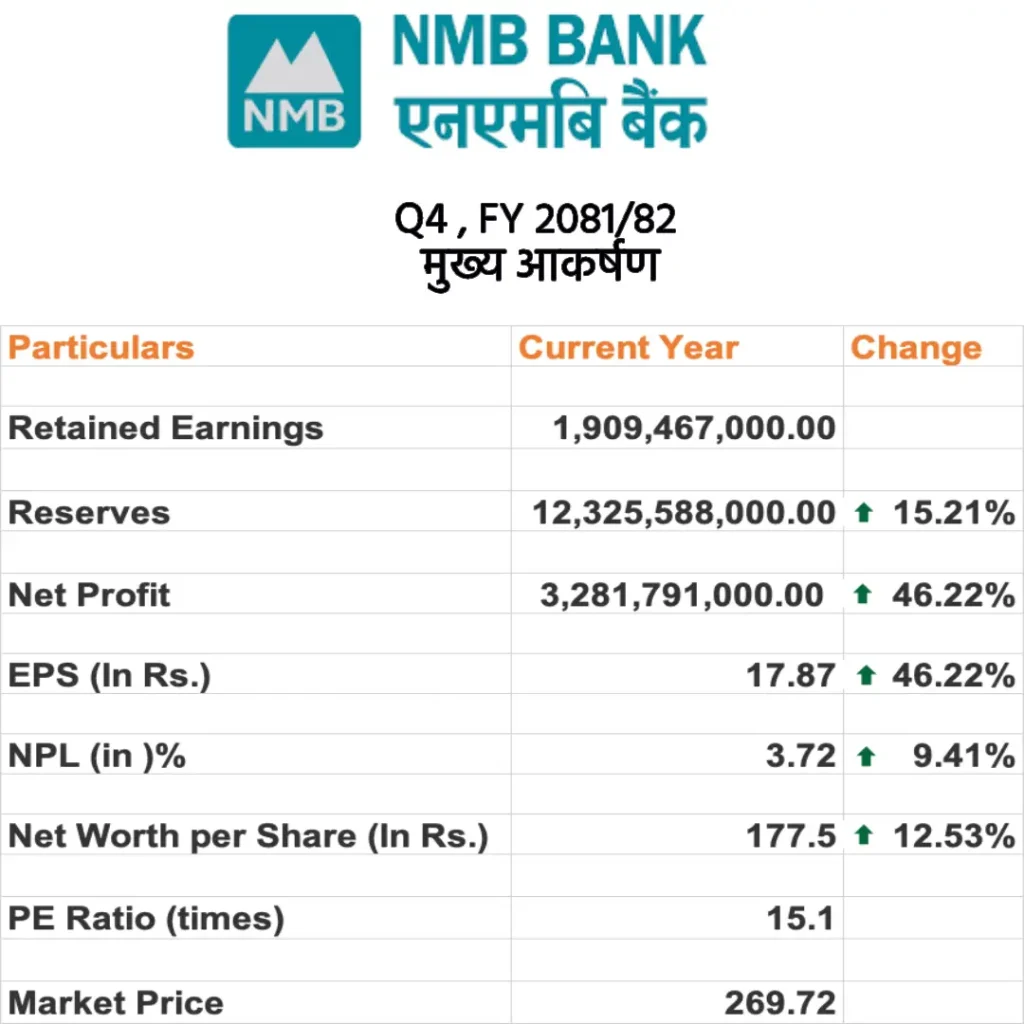समग्रमा, एनएमबी बैंकको प्रदर्शनले नेपालको बैंकिङ क्षेत्रमा यसको मजबुत स्थिति र निरन्तर नाफा तथा पूँजी वृद्धिलाई प्रतिबिम्बित गर्दछ।