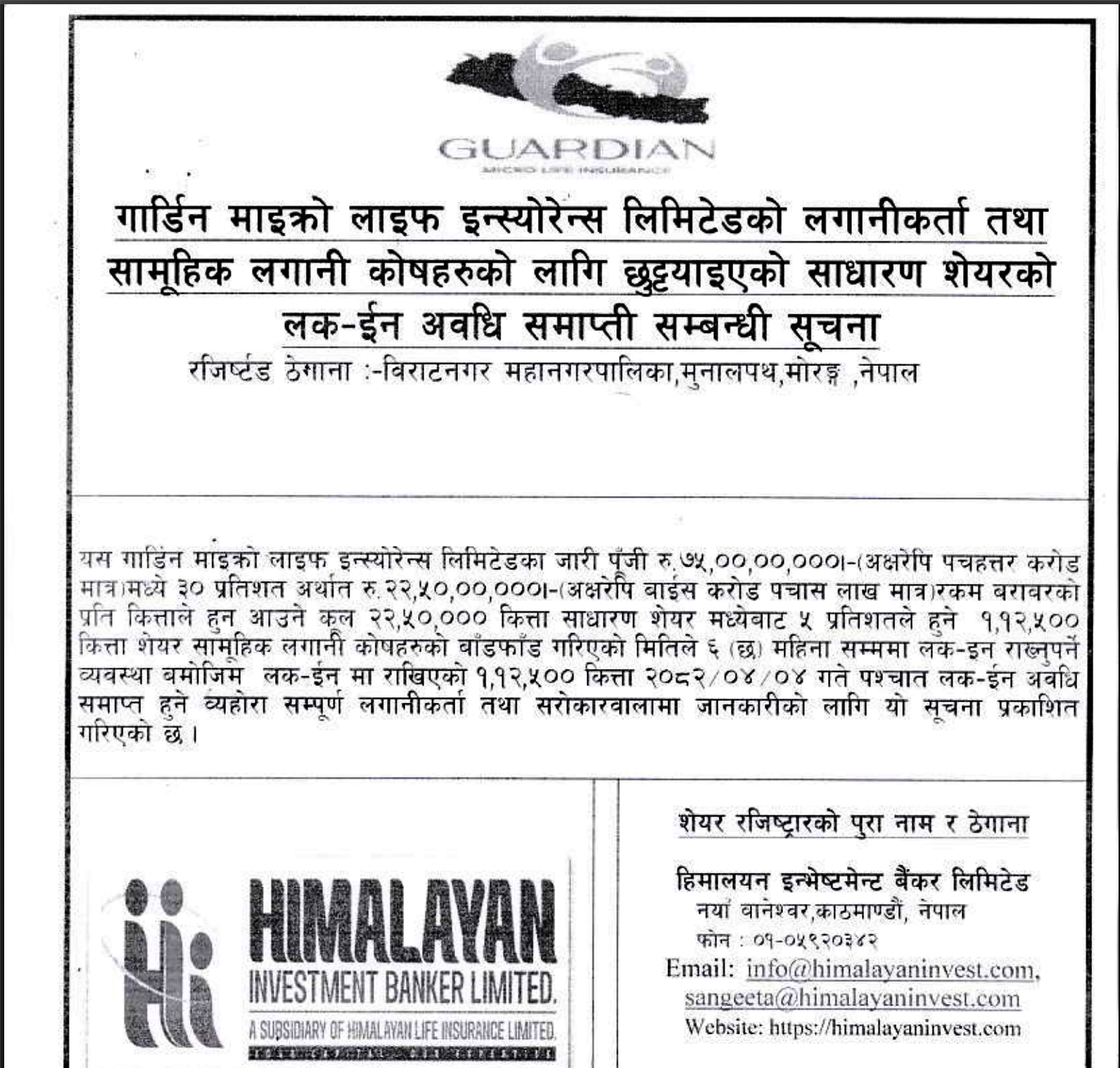गार्डियन माइक्रो लाइफ इन्स्योरेन्स लिमिटेडले आफ्नो प्राथमिक सेयर निष्कासन (IPO) को क्रममा म्युचुअल फण्डहरूलाई छुट्याएका १,१२,५०० कित्ता सेयरहरूको लक-इन अवधि समाप्त हुने मिति सार्वजनिक गरिएको छ। कम्पनीको सेयर रजिष्टार हिमालयन इन्भेष्टमेन्ट बैंकर्स लिमिटेडले जारी गरेको सूचनामा अनुसार श्रावण ४, २०८२ (जुलाई २०, २०२५) मा उक्त सेयरहरू दोस्रो बजारमा खुला रूपमा कारोबार गर्न मिल्नेछ।