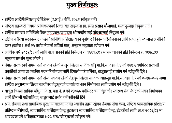 २०८२ साउन २६ गते बसेको मन्त्रिपरिषद् बेठकका १८ निर्णयहरु: