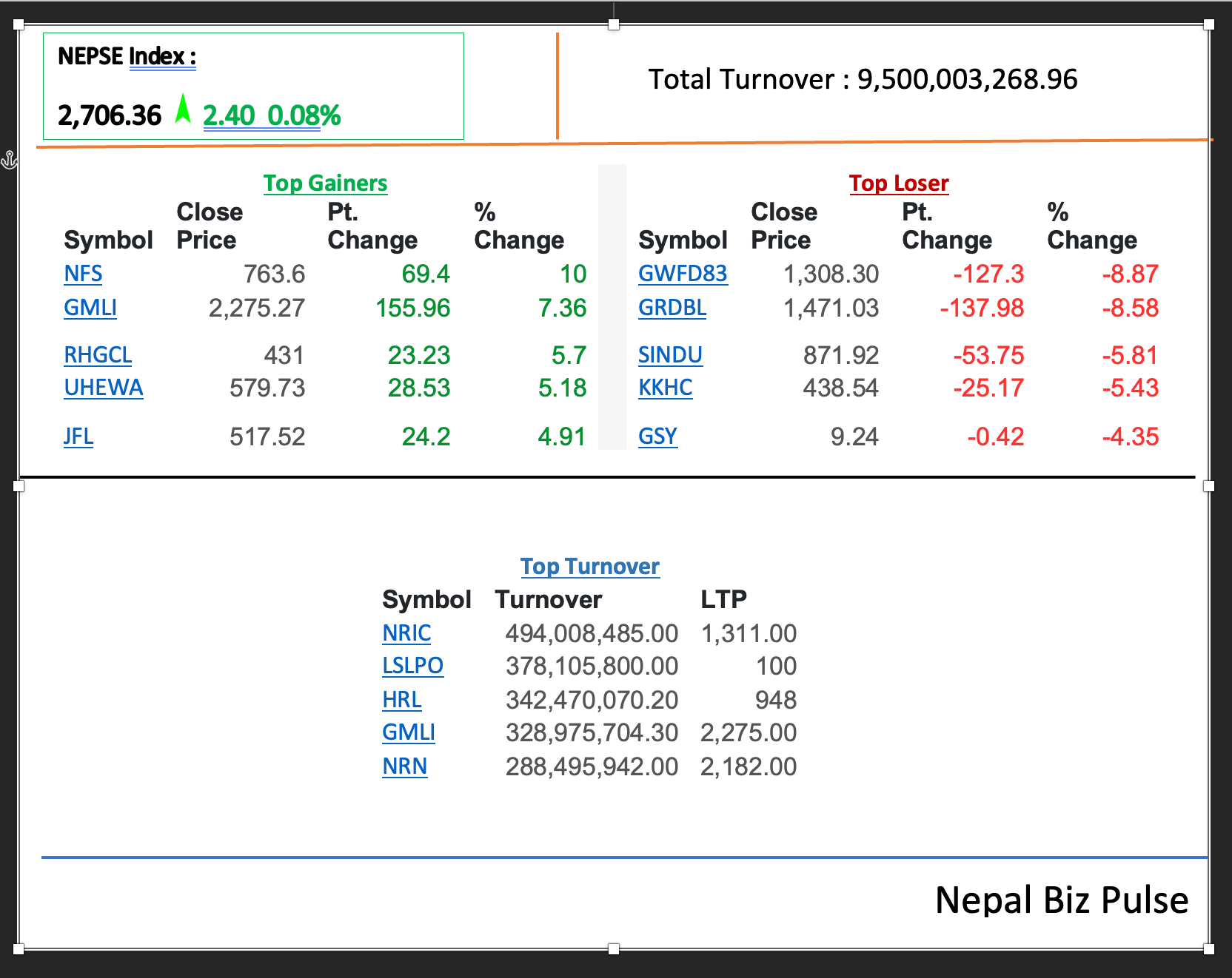 टर्नओभरका हिसाबले NRIC, LSLPO, र HRL जस्ता कम्पनीहरूले सबैभन्दा बढी कारोबार गरेका छन्। सबैभन्दा बढी कारोबार रकम NRIC मा देखिएको छ, जुन करिब ४९ करोड रुपैयाँभन्दा बढी हो। यी डाटाहरूले स्पष्ट देखाउँछ कि बजार अझै मिश्रित अवस्थामा छ — केही स्टकमा उत्साहजनक सुधार, केहीमा गिरावट — तर समग्रमा लगानीकर्ता अझै पर्ख र हेरको अवस्थामा छन्।