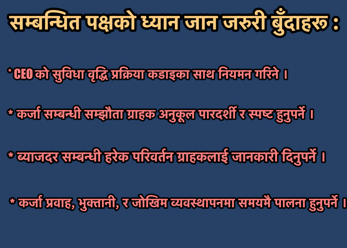 साथै, ब्याजदर अन्तर गणनामा त्रुटि, नयाँ ऋणद्वारा पुराना कर्जा चुक्ता गर्ने अभ्यास, जमानतको समयमा भुक्तानी नगर्ने, तथा चालु पूँजी कर्जा व्यवस्थापनमा कमजोरी देखिएको छ। यसबाट बैंकको आन्तरिक नियमन प्रणालीप्रति गम्भीर प्रश्न खडा भएको राष्ट्र बैंकको धारणा छ। फलस्वरूप, बैंक सञ्चालक समिति र CEO दुबैलाई राष्ट्र बैंक ऐन, २०५८ को दफा १००(२)(क) बमोजिम सचेत गराइएको हो।